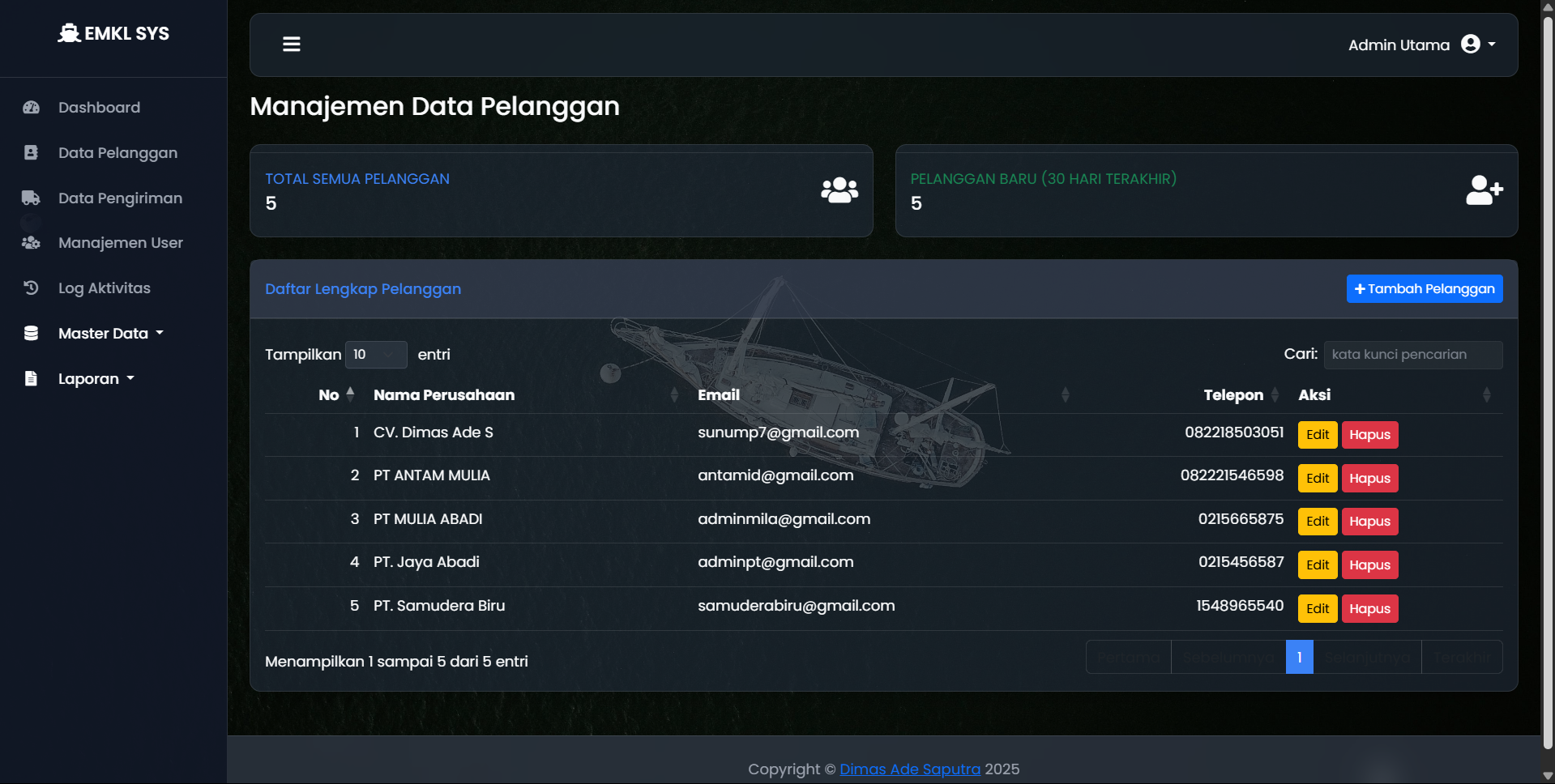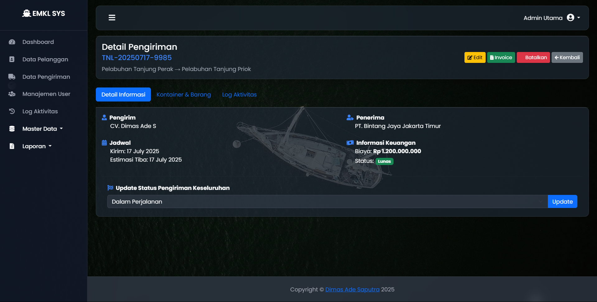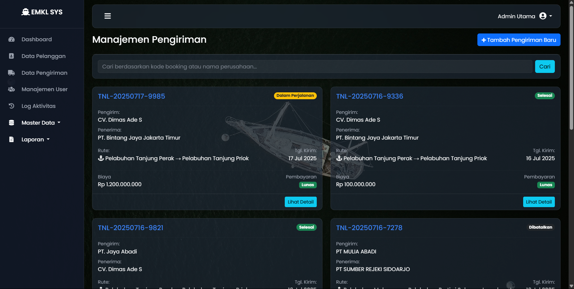 Perusahaan ekspedisi muatan kapal laut (EMKL) memerlukan sistem terpusat untuk mengelola operasional yang kompleks, mulai dari data pelanggan, jadwal pengiriman, status kontainer, hingga pelaporan keuangan. Pencatatan manual sangat rentan terhadap kesalahan dan tidak efisien.