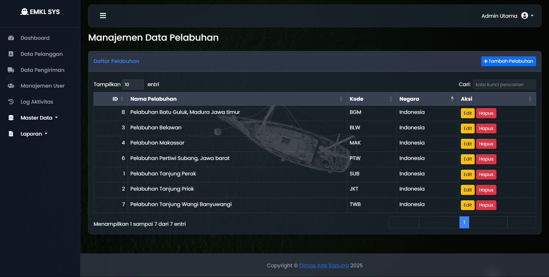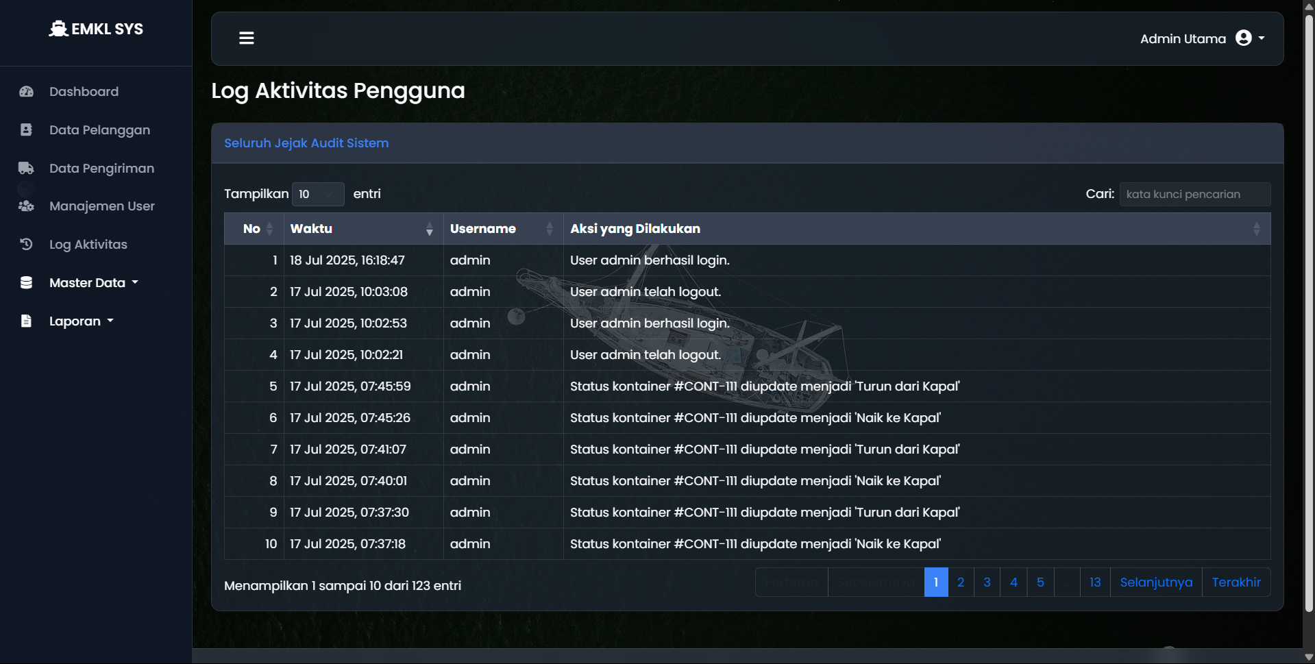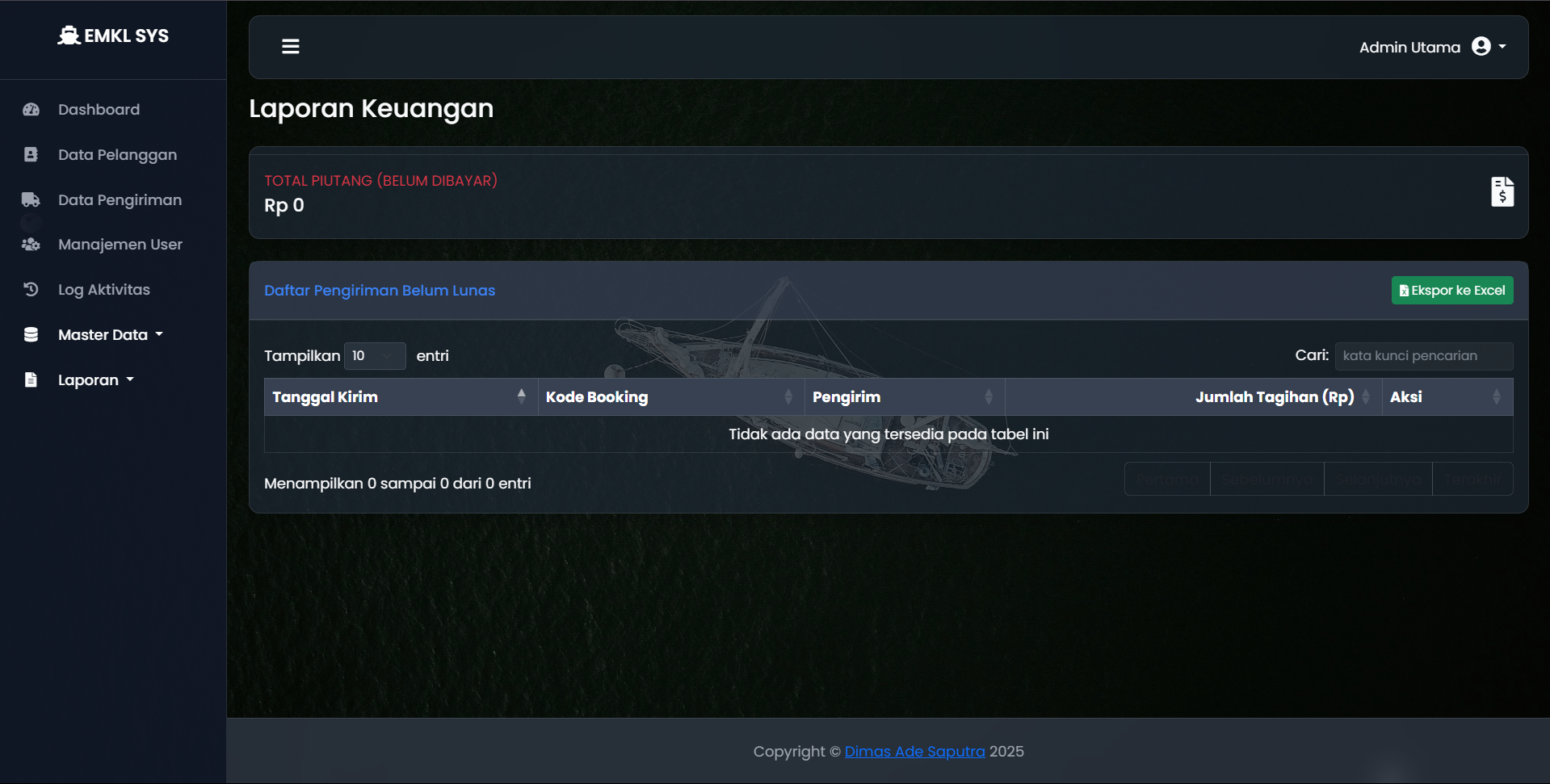Perusahaan ekspedisi muatan kapal laut (EMKL) memerlukan sistem terpusat untuk mengelola operasional yang kompleks, mulai dari data pelanggan, jadwal pengiriman, status kontainer, hingga pelaporan keuangan. Pencatatan manual sangat rentan terhadap kesalahan dan tidak efisien.